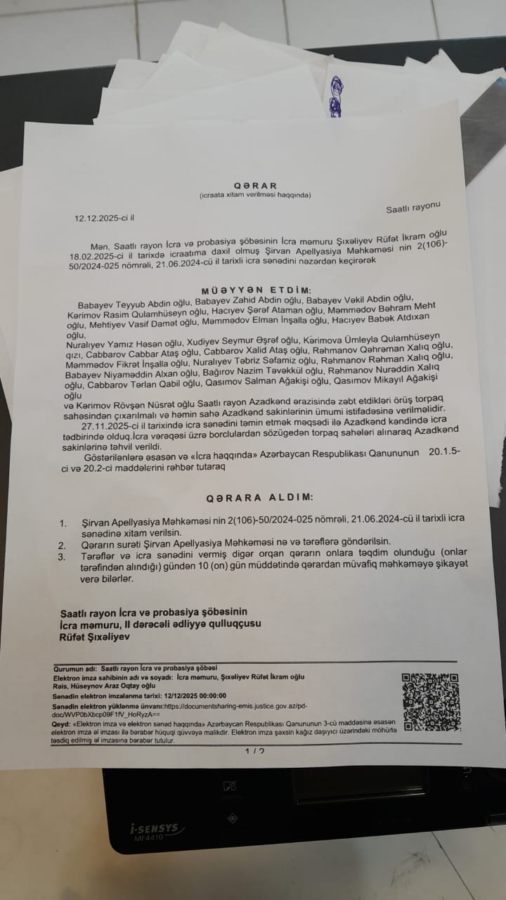 Demiryumruq.az saytına daxil olan yeni məlumatlarda bildirilir ki, məhkəmə qərarı icra olunmaq əvəzinə daha da qanunlara saymamazlıq edilir. Belə ki, məhkəmənin qərarına əsasən zəbt olunmuş örüş torpaq sahələri təcili sürətdə kənd sakinlərin ixtiyarına verilməli idi. Nəticə etibarı ilə muqavilədə göstərilir ki, 27.11. 2025-ci il tarixdə icra sənədini təmin etmək məqsədi ilə Azadkənd kəndində icra tədbiri olunmalı və icra vərəqəsi üzrə borclular sözügedən torpaq sahələrində çıxarılmalıdır. Lakin Saatlı Rayon İcra və Probasiya Şöbəsinin rəisi Araz Hüseynov "icrata xitam verilməsi haqqında" qərar qəbul edərək, bir növ dövlətə qarşı ən böyük qanun pozuntusuna yol verib. Əslində, qərar icra məmuru Şıxəliyev Rüfət İkram oğlu tərəfindən verilsədə rəisin sifarişini icra edildiyi məlumdur. Bununlada özünün söylədiyi kimi "Məhkəmənin qərarı Allahın qərarı deyil ki, əlinizdə bayraq tutmusuz" deməklə məhkəmə qərarını bir kağız parçası olduğunu sübüt etdi.